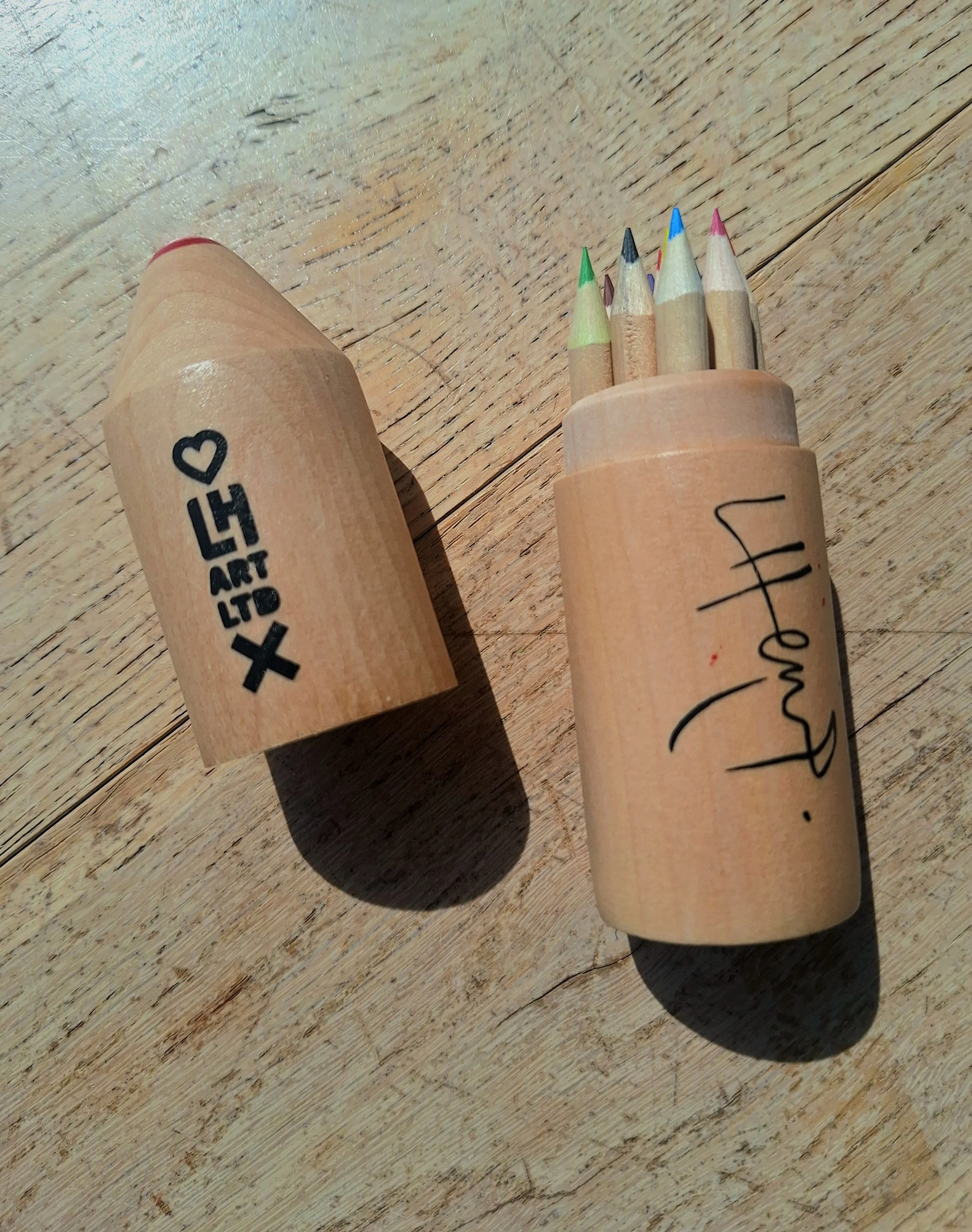 A set of 12 colouring pencils housed in a lovely, (signed by me) wooden pencil case