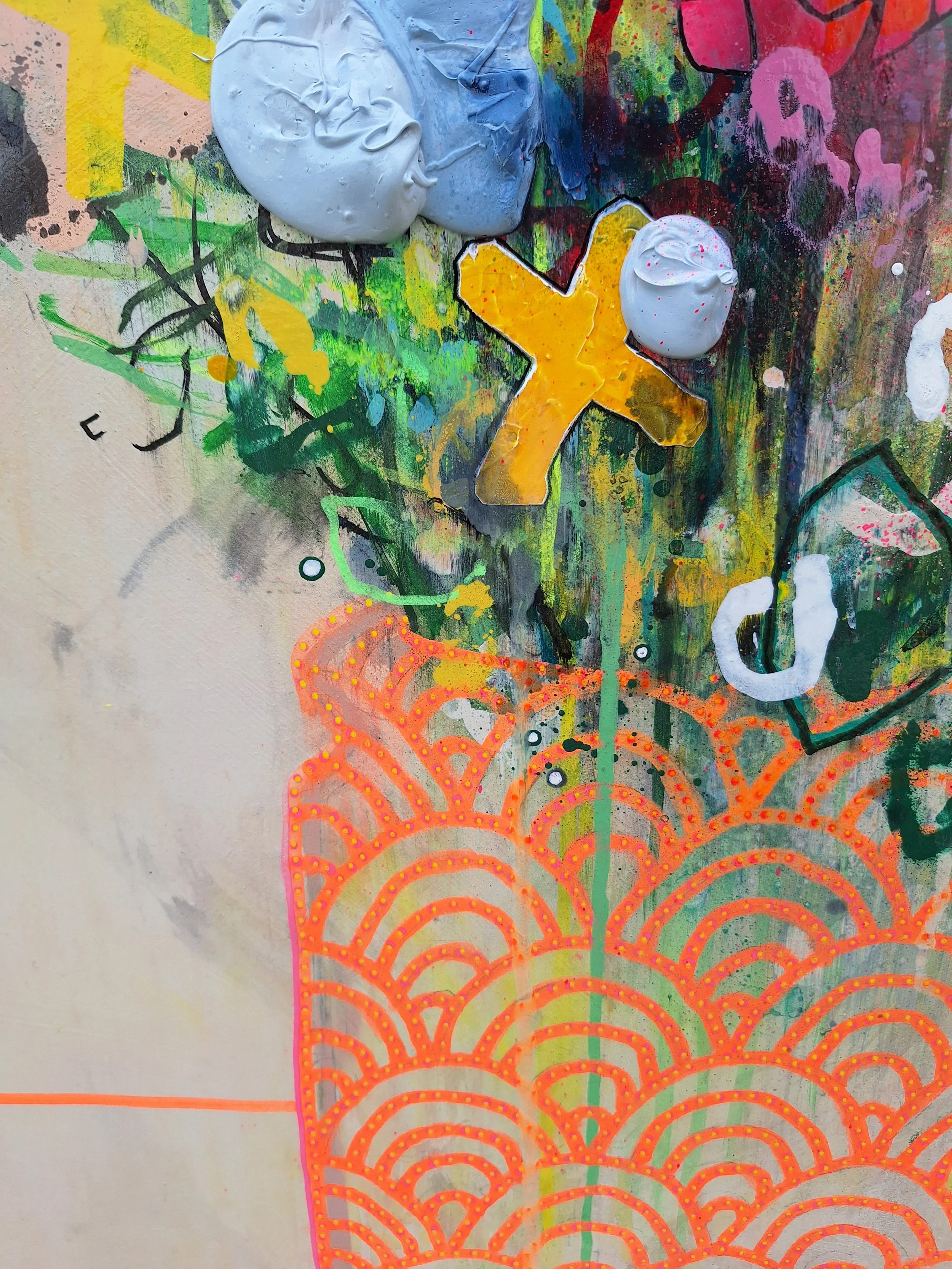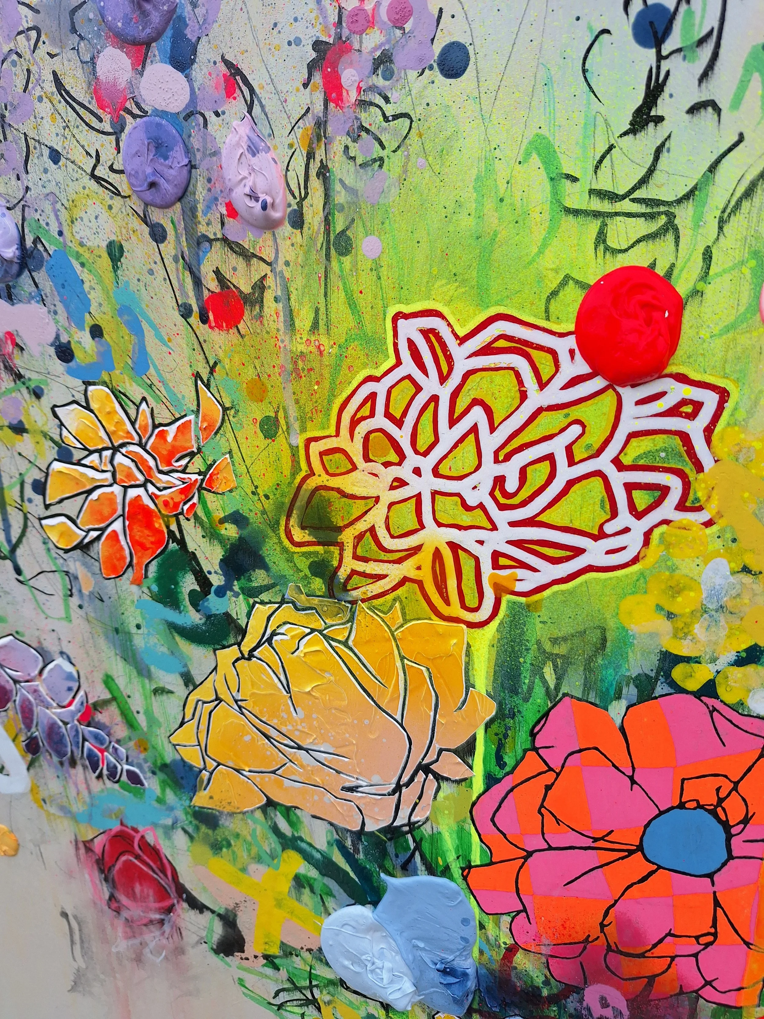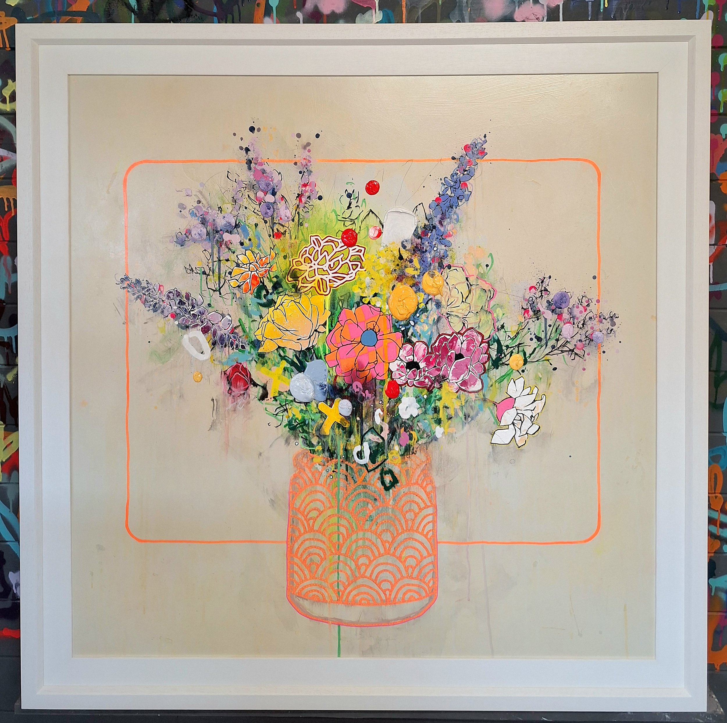 Original mixed media painting on board. Pens, spray and acrylics are finished with a gloss varnish. Supplied framed in white. Framed dimensions are 115 x 115cms.