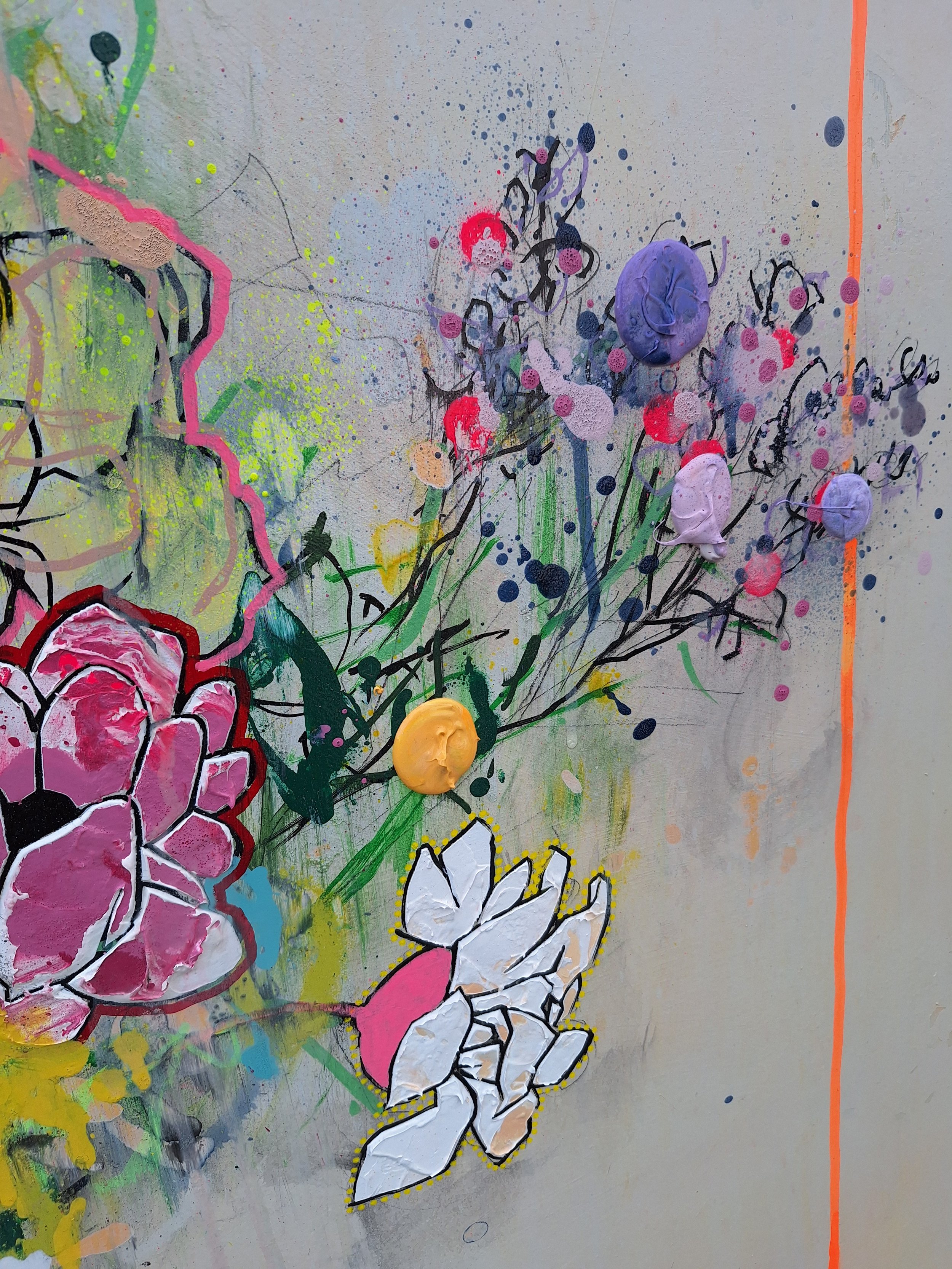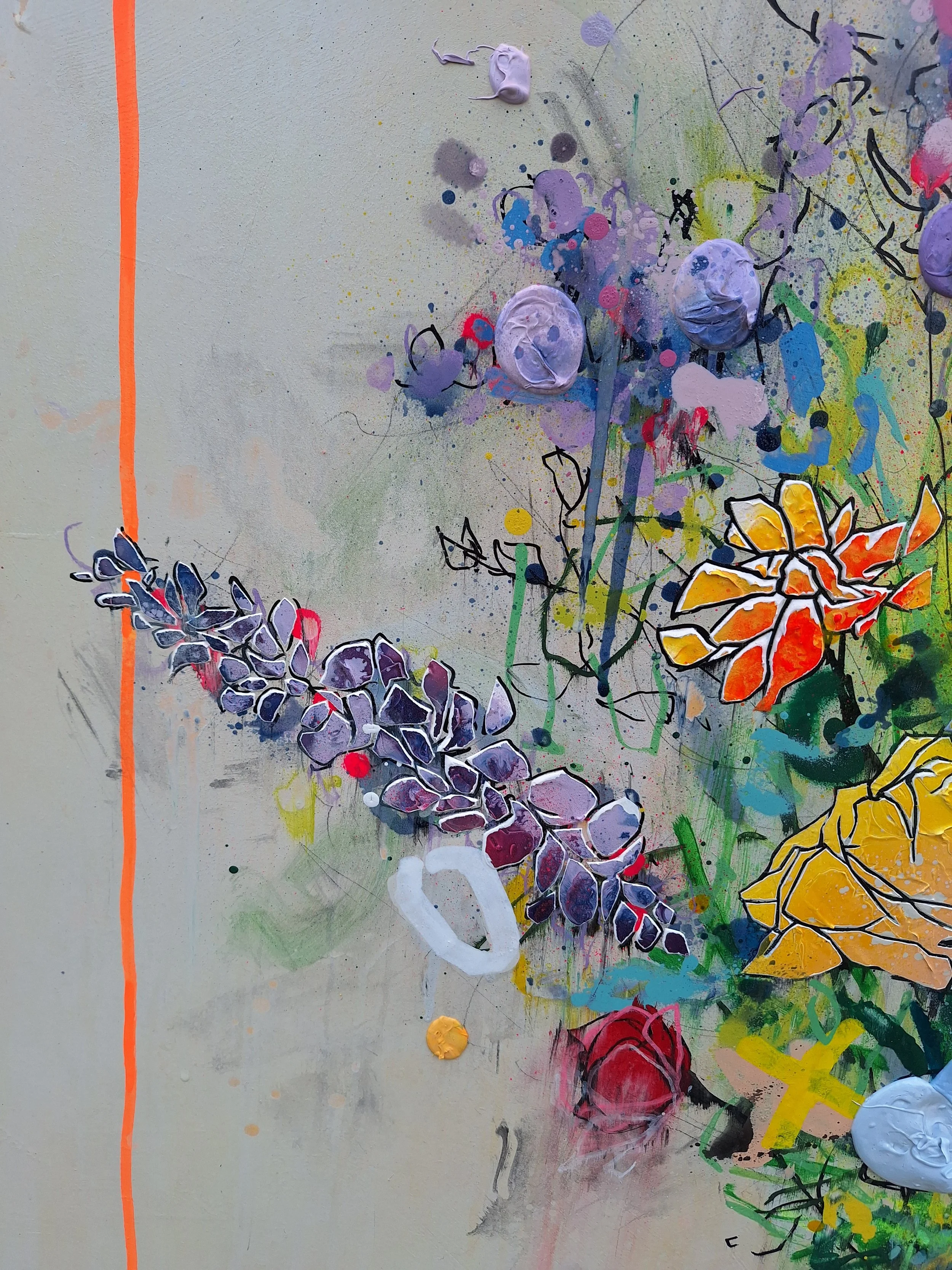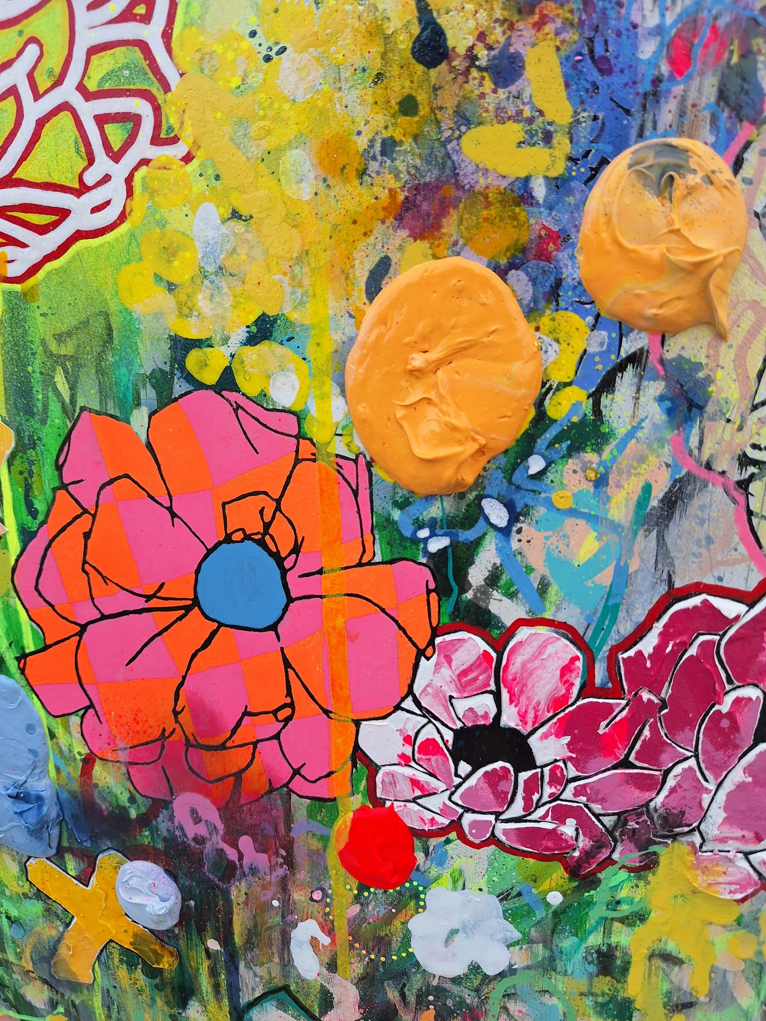 Original mixed media painting on board. Pens, spray and acrylics are finished with a gloss varnish. Supplied framed in white. Framed dimensions are 115 x 115cms.