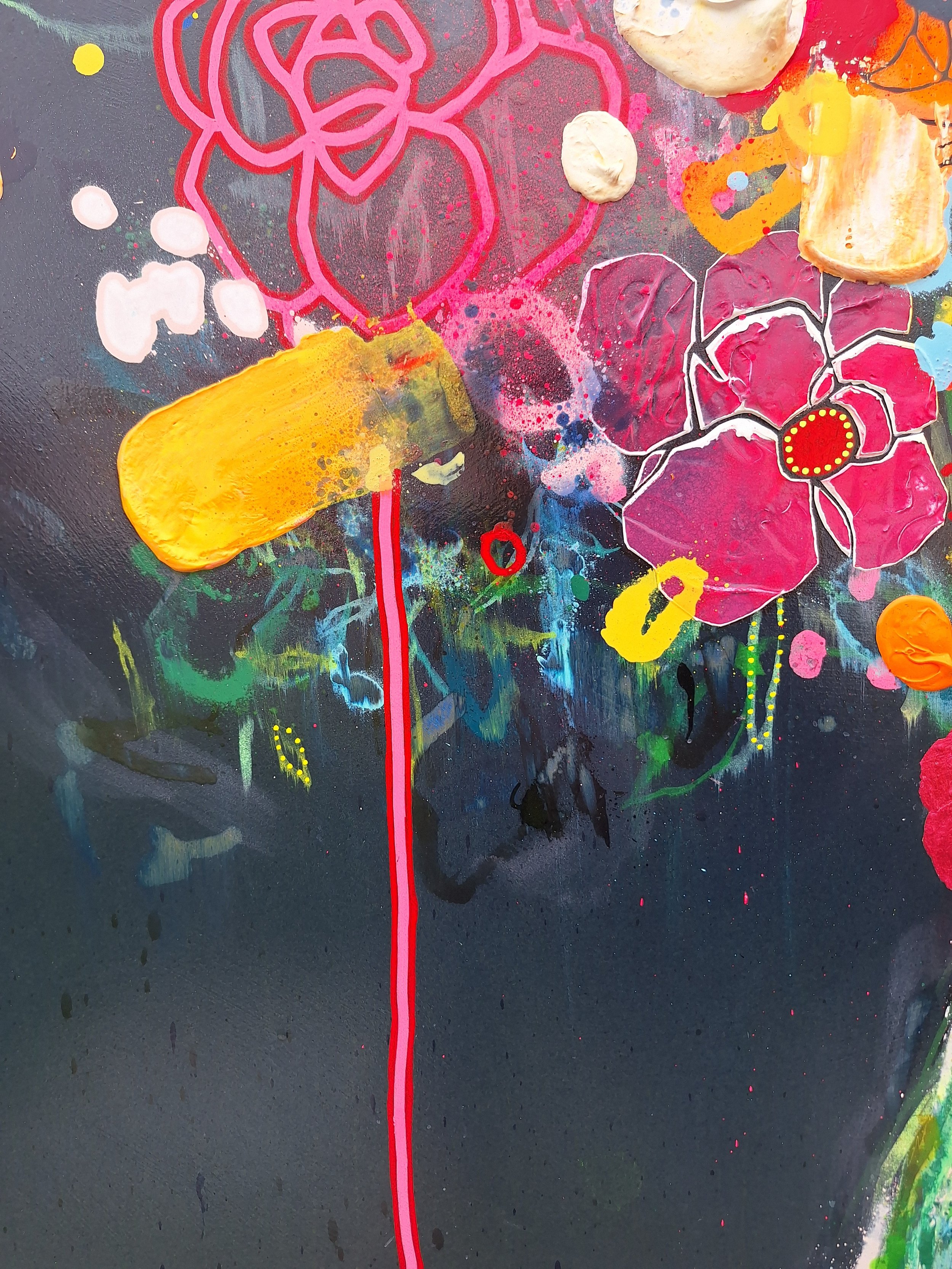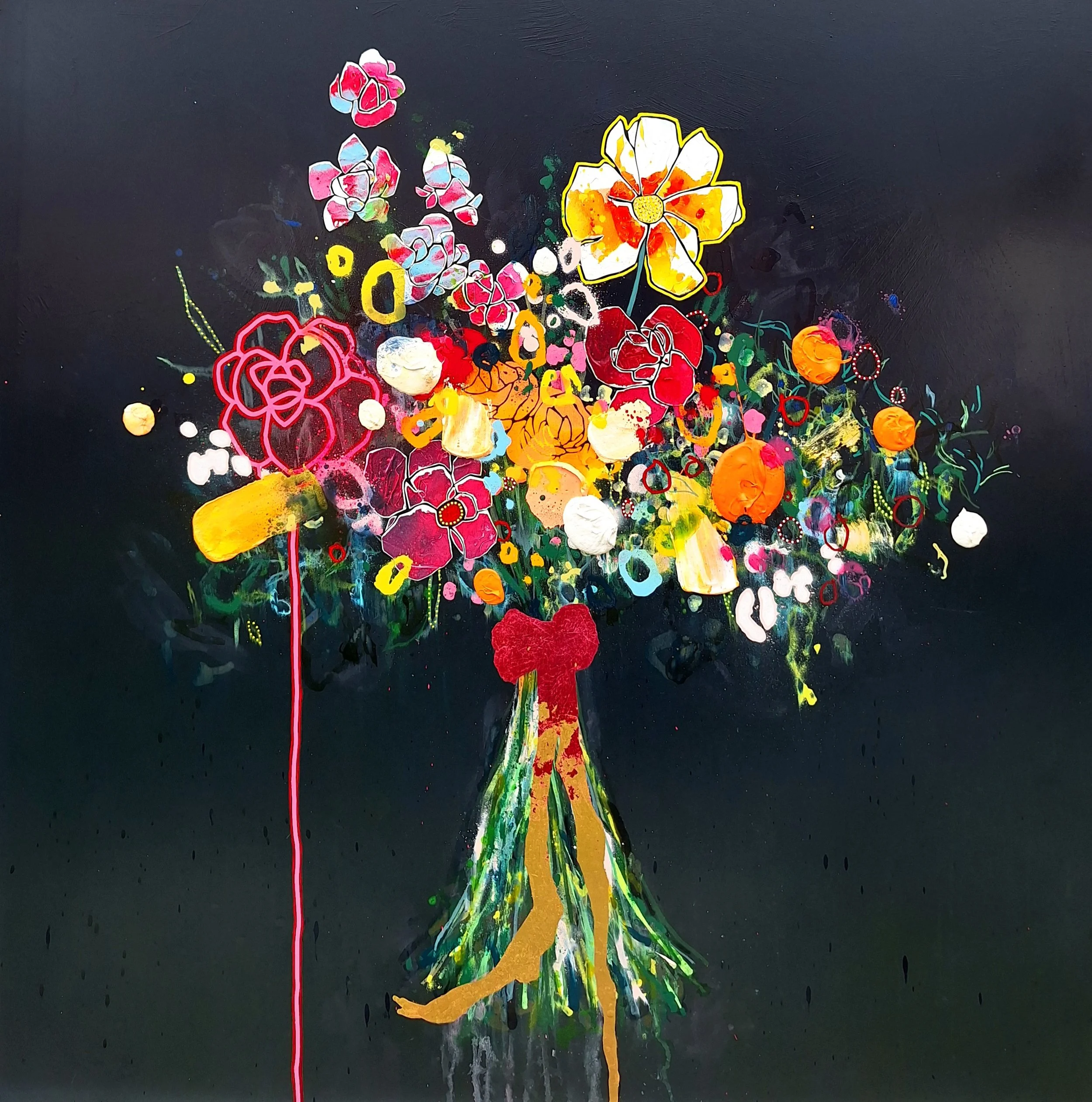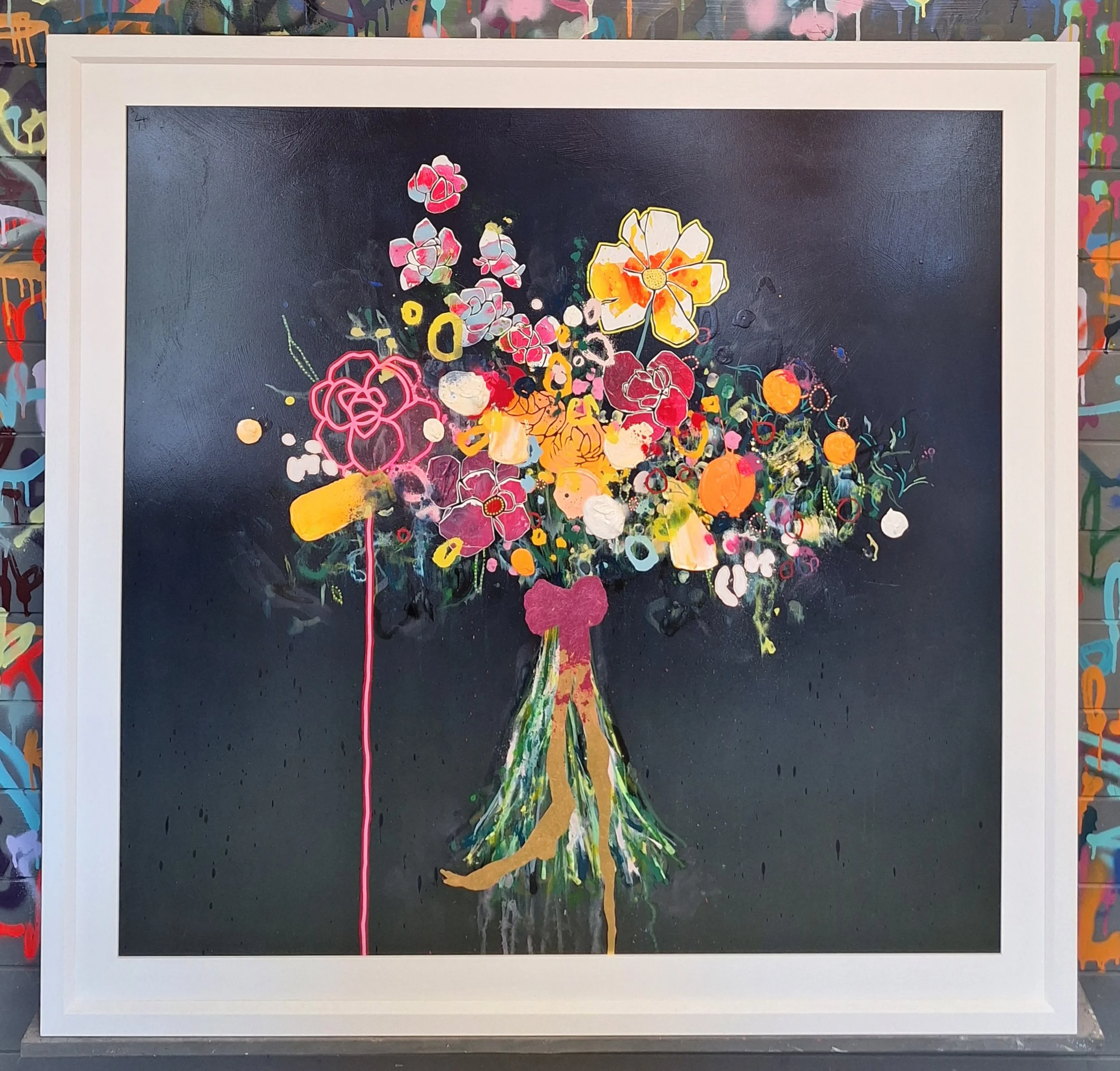 Original mixed media painting on board. Pens, spray and acrylics are finished with a gloss varnish. Supplied framed in white. Framed dimensions are 115 x 115cms.