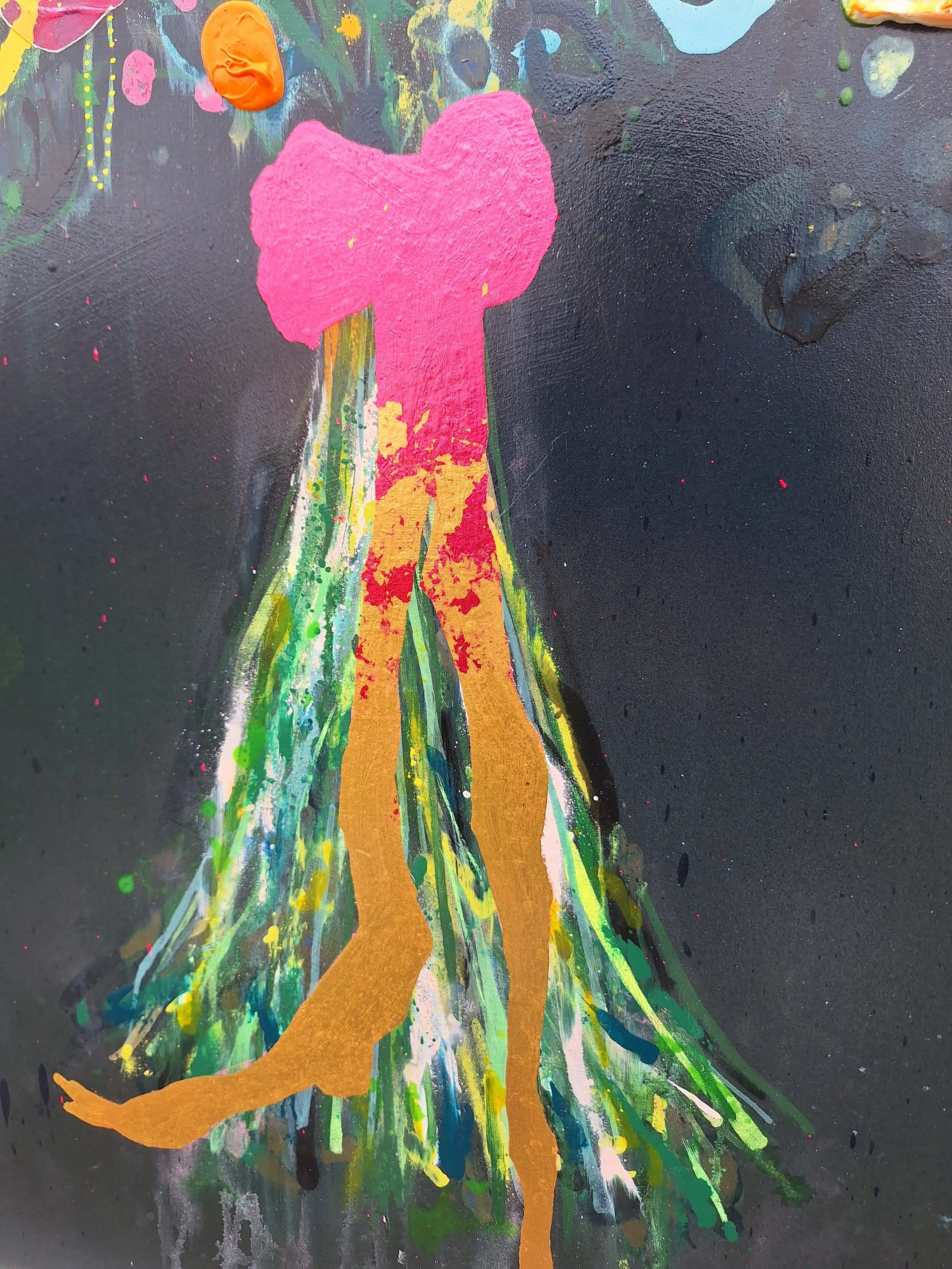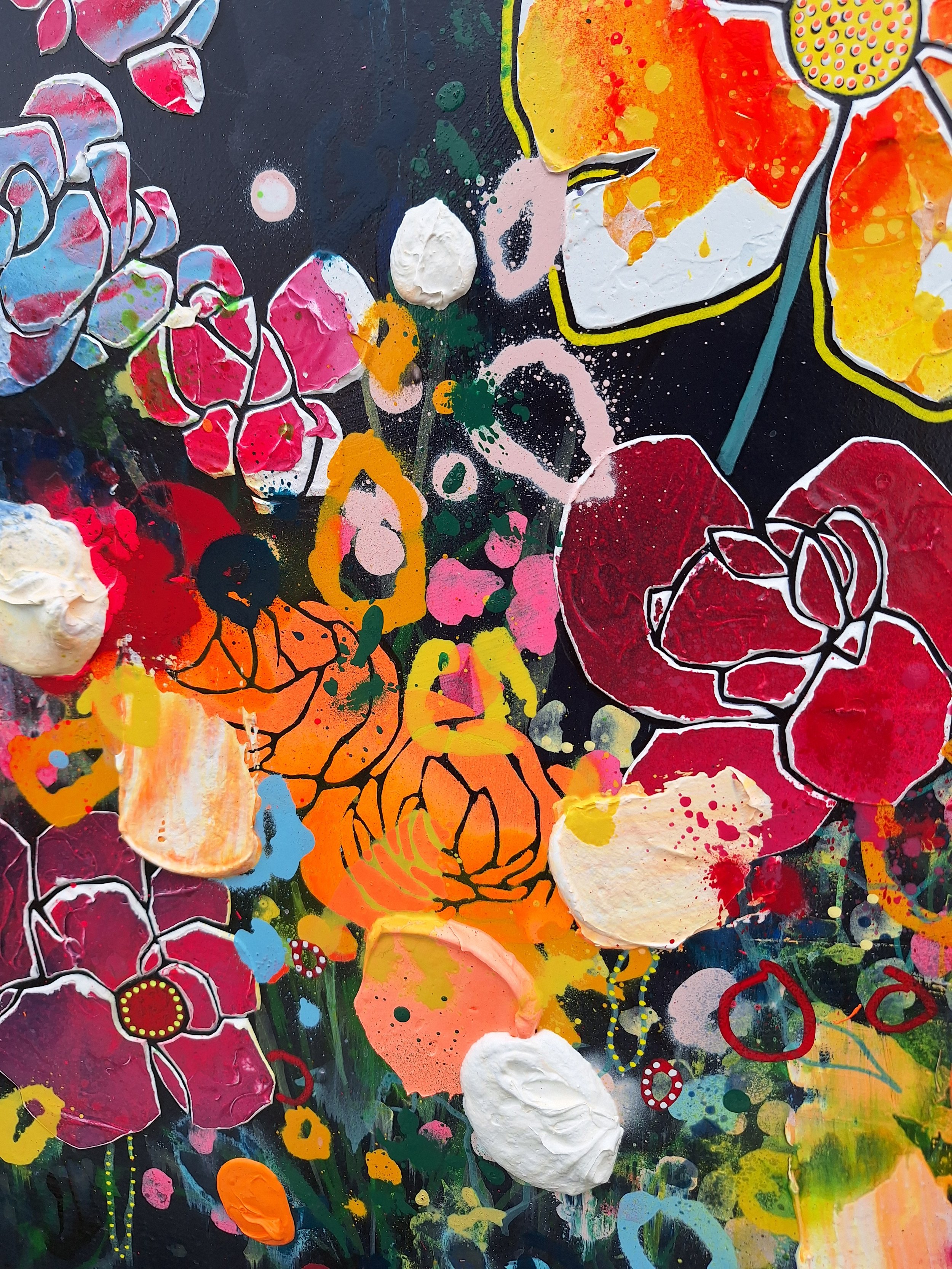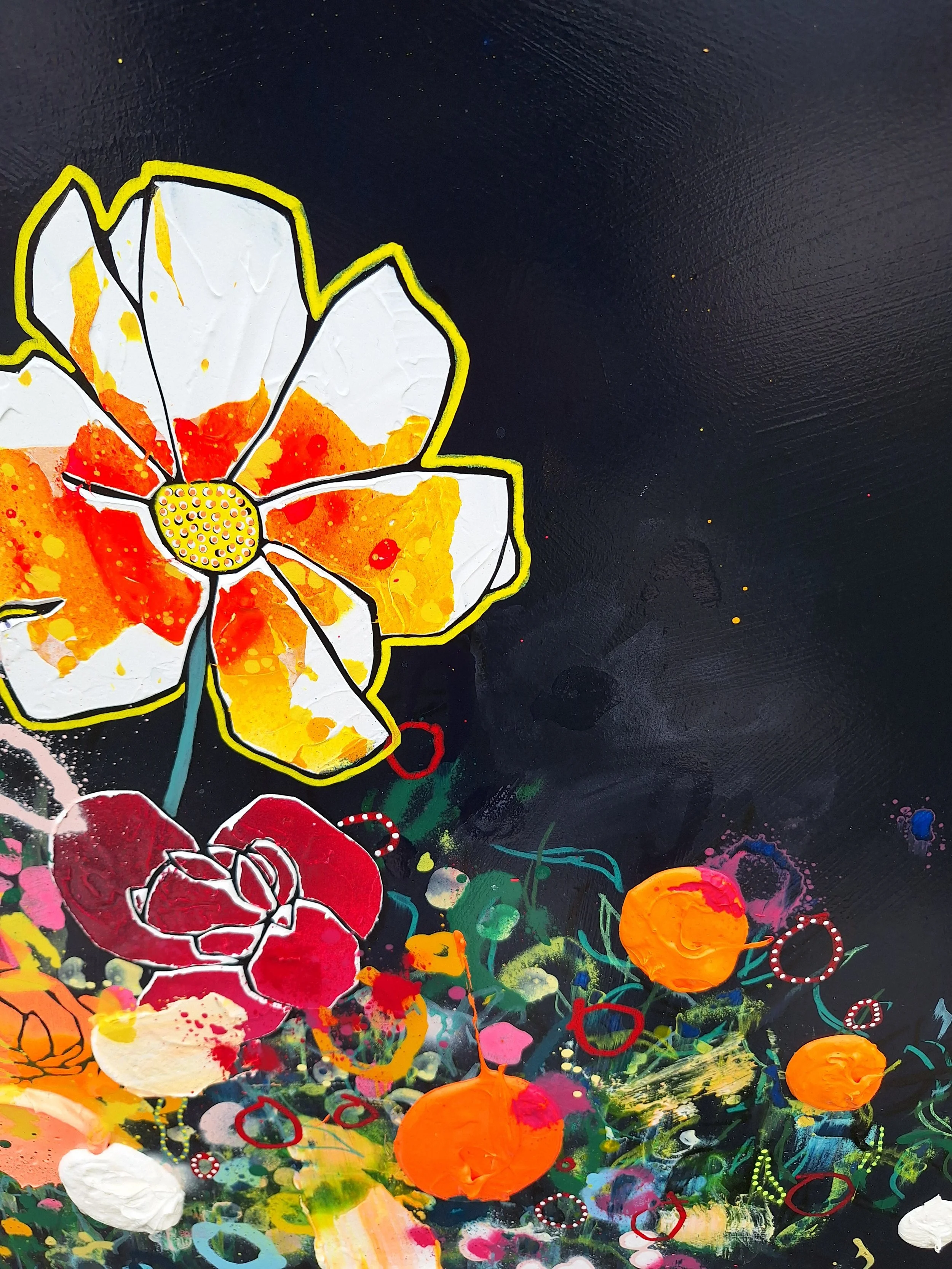 Original mixed media painting on board. Pens, spray and acrylics are finished with a gloss varnish. Supplied framed in white. Framed dimensions are 115 x 115cms.